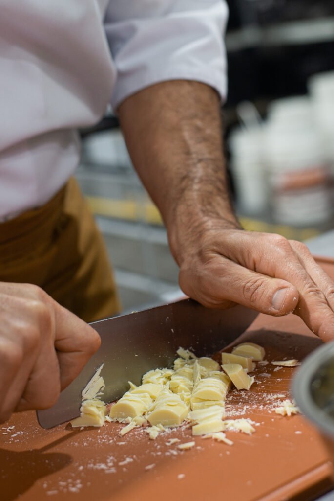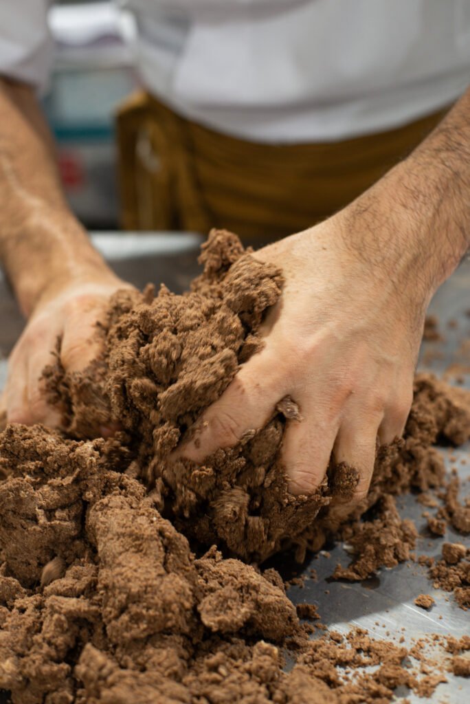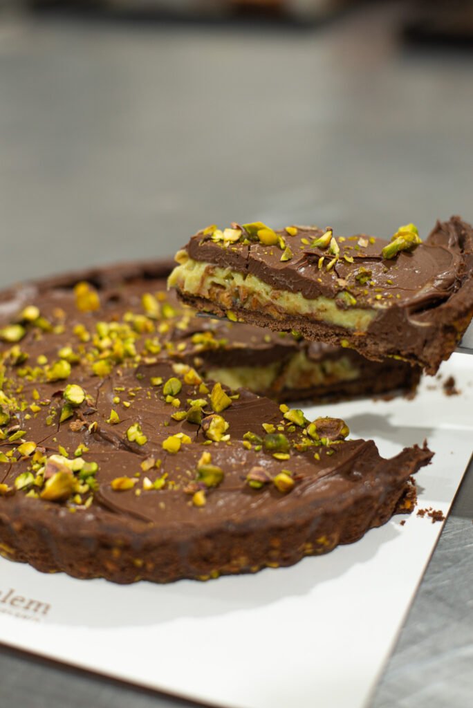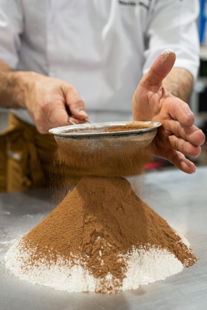 Todo comienza con la preparación de la masa de chocolate y pistachos seleccionados. Mezclamos harina y cacao en polvo e incorporamos manteca de calidad en cubos y huevos. Integramos todos los ingredientes hasta lograr una textura suave y homogénea, para luego estirarla y llevarla al espesor deseado. Antes de hornearla, cubrimos la superficie con una lluvia de pistachos picados que realzan el sabor y aportan una textura crujiente.
