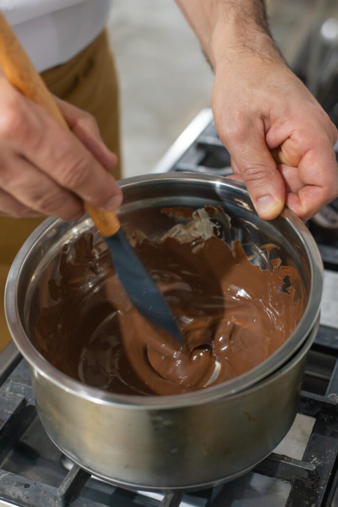 Con la base ya horneada y el kadayif listo, llega el momento del armado. Primero colocamos una generosa capa de pasta de pistacho sobre la base. Luego, volcamos por encima una ganache de chocolate negro brillante, que corona la tarta con profundidad, intensidad y elegancia. Esta ganache, elaborada con crema y chocolate semiamargo de calidad, sella todos los sabores en una sola pieza.